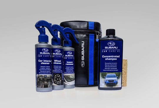 Sada autokosmetiky na kompletní péči o Vaše SUBARU. Autošampón, čistič interiéru, čistič disků, odstraňovač hmyzu a mycí houba v obalu se SUBARU logem.