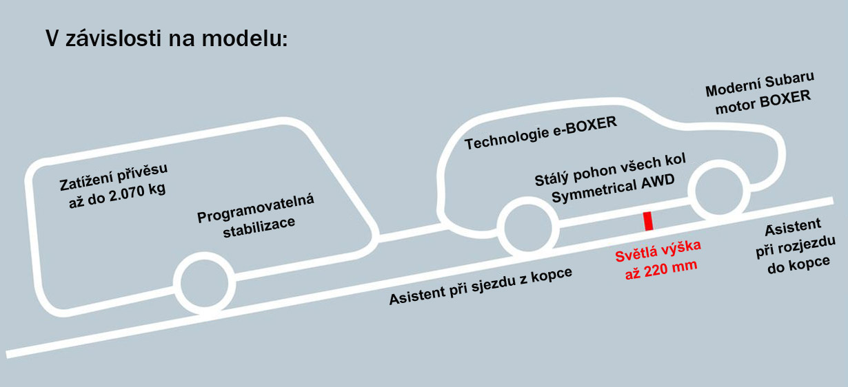 *1 EyeSight je systém na podporu řízení, jenž za některých jízdních podmínek nemusí fungovat optimálně. Za bezpečnost jízdy vždy zodpovídá řidič, jenž je povinen věnovat pozornost řízení a dodržovat dopravní předpisy. Účinnost fungování systému závisí na celé řadě faktorů, mj. údržbě vozidla, klimatických podmínkách a stavu vozovky. Veškeré podrobnosti k fungování systému najdete v Uživatelské příručce, kde jsou též uvedena omezení systému EyeSight, včetně funkcí popisovaných v tomto prospektu.
