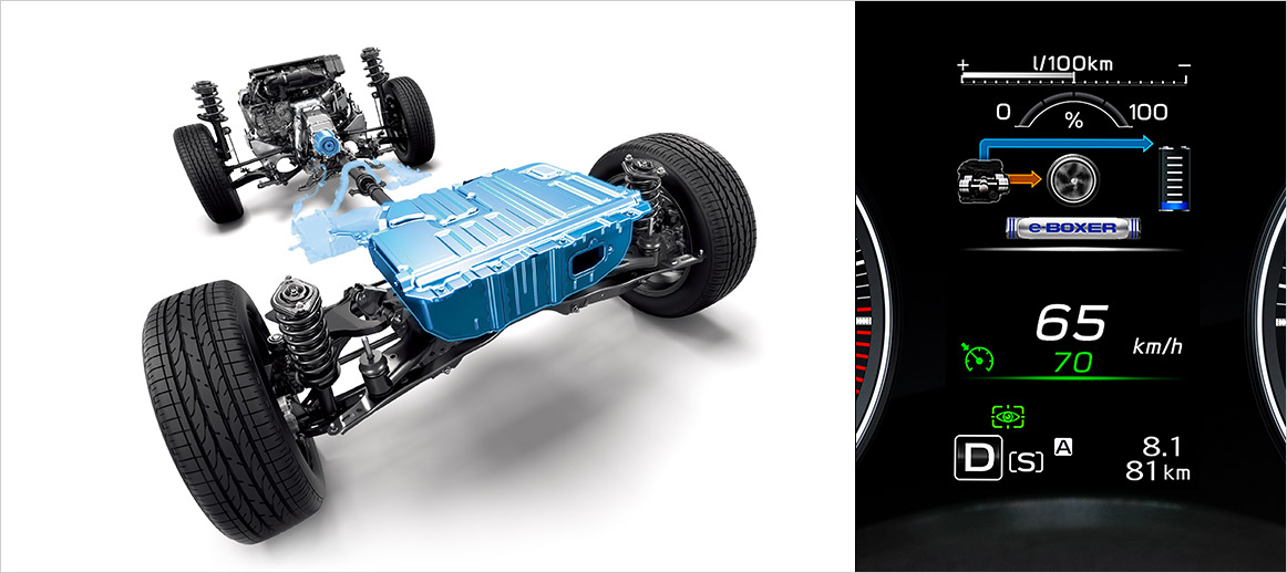 Systém SUBARU e-BOXER rozděluje hnací sílu mezi zážehový motor 2,0 litru s přímým vstřikem a elektromotor tak, aby se při co největší hospodárnosti přizpůsobil aktuálním jízdním podmínkám. Ve spojení s převodovkou Lineatronic ohromuje také minimální hlučností, mimořádnou jemností a podmanivou dynamikou. Samozřejmostí je proto komfort spojený se svěžím projevem. Motor je spolu s akumulátorem umístěn v podélné ose vozu, což přispívá nejen k optimálnímu rozložení hmotnosti, ale také nízkému těžišti – to jsou ostatně typické vlastnosti pro vozy Subaru vybavené motory SUBARU BOXER a pohonem Symmetrical AWD.