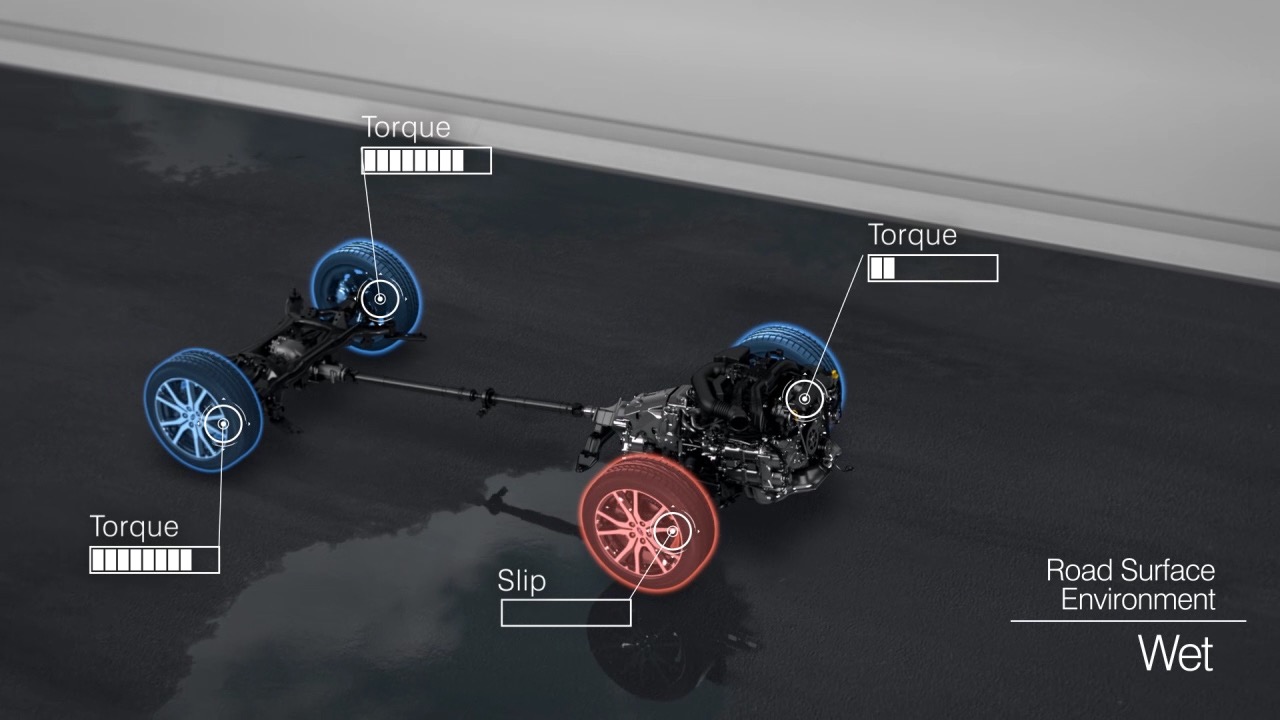 Systém pohonu všech kol pro vozy s manuální převodovkou s vyrovnaným rozložením hnací síly tvoří mezinápravový diferenciál s viskózní spojkou. Za normálních podmínek je točivý moment rozdělován v poměru 50:50. Tím maximalizuje trakci a zajišťuje stabilní jízdní vlastnosti. V případě, že se kola přední nebo zadní nápravy protočí, nebo když se rychlost...